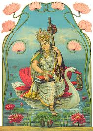 La diosa de la sabiduria, del arte, la poesía y la música, su nombre, cuyo significado es "quien ha descendido del sol". Es la diosa de la sabiduría y la ciencia, la madre de los Vedas y la inventora del alfabeto Devanagari, el sánscrito. Es la esposa de Brahma y embarazada por este, lleva durante cien años celestiales el embrión del día y de la noche. Se la representa como a una mujer joven y hermosa con cuatro brazos. Con una de sus manos derechas le ofrece una flor a su marido, a cuyo lado permanece continuamente, y con la otra sostiene un libro de bolas de palmera, indicando que es amante del saber. Todo ello explica que aún sea muy popular en los colegios y en las universidades. En una de sus manos izquierdas lleva un collar de perlas, llamado Sivamla "collar de Siva", que sirve de rosario y en la otra un damaru, o pequeño tambor. En otras ocasiones se la representa sólo con dos brazos y sentada sobre un loto, tocando una especie de banjo. Mora en la tierra entre los hombres, pero su morada especial está situada en el Brahmaloka, junto a su marido. Como Sarasvati fue creada por Brahma era considerada por éste como su hija; por eso su unión con él fue considerada como un delito por los demás dioses. Algunas veces se la considera esposa de Vishnu. Su vehículo es el cisne, o el pavo real, símbolo del discernimiento o de la vanidad sobre la que triunfa el conocimiento.